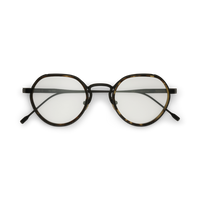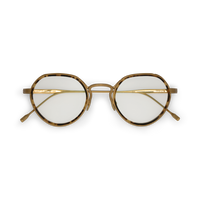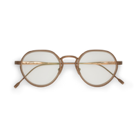 The Annie-O is a round frame with a Windsor rim, featuring handmade acetate wrapped around the titanium eyewire. Its sleek, Art-Deco-inspired step-cut temples bring unique character to the design.