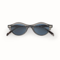 An oval silhouette with added acetate anchors. Custom front pin ornaments with Art-Deco inspired filigree. 5-barrel hinge system, 2-base lenses with backside anti-reflective coating treatment and 100% UV protection. | |