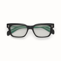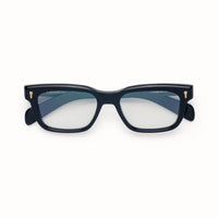 A classic, rectangular silhouette featuring custom front pin ornaments with Art-Deco hairline filigree. 7-barrel hinges with a custom spur shaped riveting system. 2-base Nylon lenses with backside anti-reflective coating treatment and 100% UV protection. | |