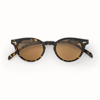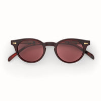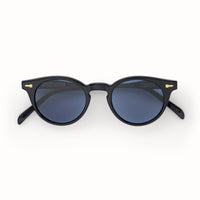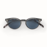 A P-3 circular silhouette with a distinctive key-hole bridge. Custom front pin ornaments with Art-Deco hairline filigree. 5-barrel hinges with a custom spur shaped riveting system. 2-base Nylon lenses with backside anti-reflective coating treatment and 100% UV protection.