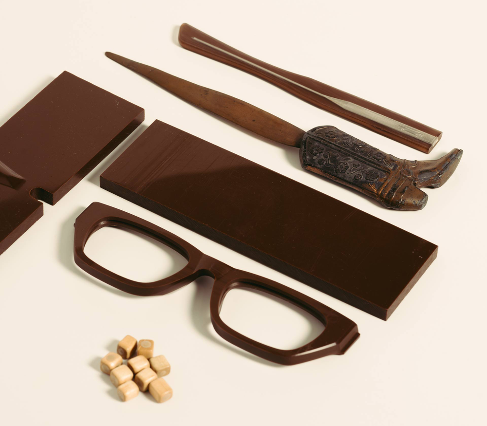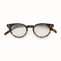 A P-3 circular silhouette with a distinctive key-hole bridge. Custom front pin ornaments with Art-Deco hairline filigree. 5-barrel hinges with a custom spur shaped riveting system. 2-base Nylon lenses with backside anti-reflective coating treatment and 100% UV protection. | |