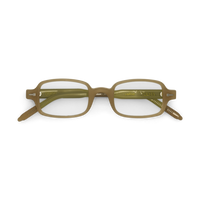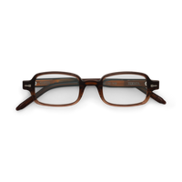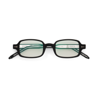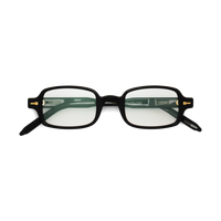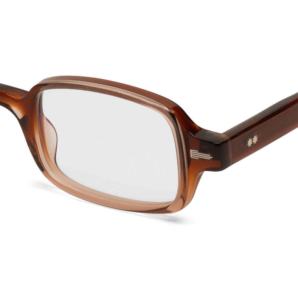 A late 1950’s inspired rectangular silhouette featuring subtle step-cut details on the frame front and temple tips. Custom front pin ornaments with Art-Deco hairline filigree. 5-barrel hinges with a custom spur shaped riveting system. 2-base Nylon lenses with backside anti-reflective coating treatment and 100% UV protection. | |