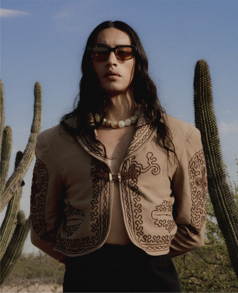 Bold rectangular silhouette. Custom front pin ornaments with Art-Deco hairline filigree. 7-barrel hinges with custom spur shaped riveting system. 2 base Nylon lenses with backside anti-reflective coating and 100% UV protection.