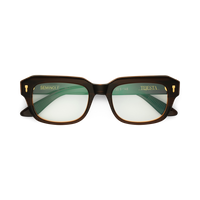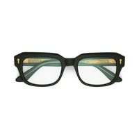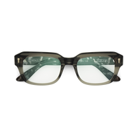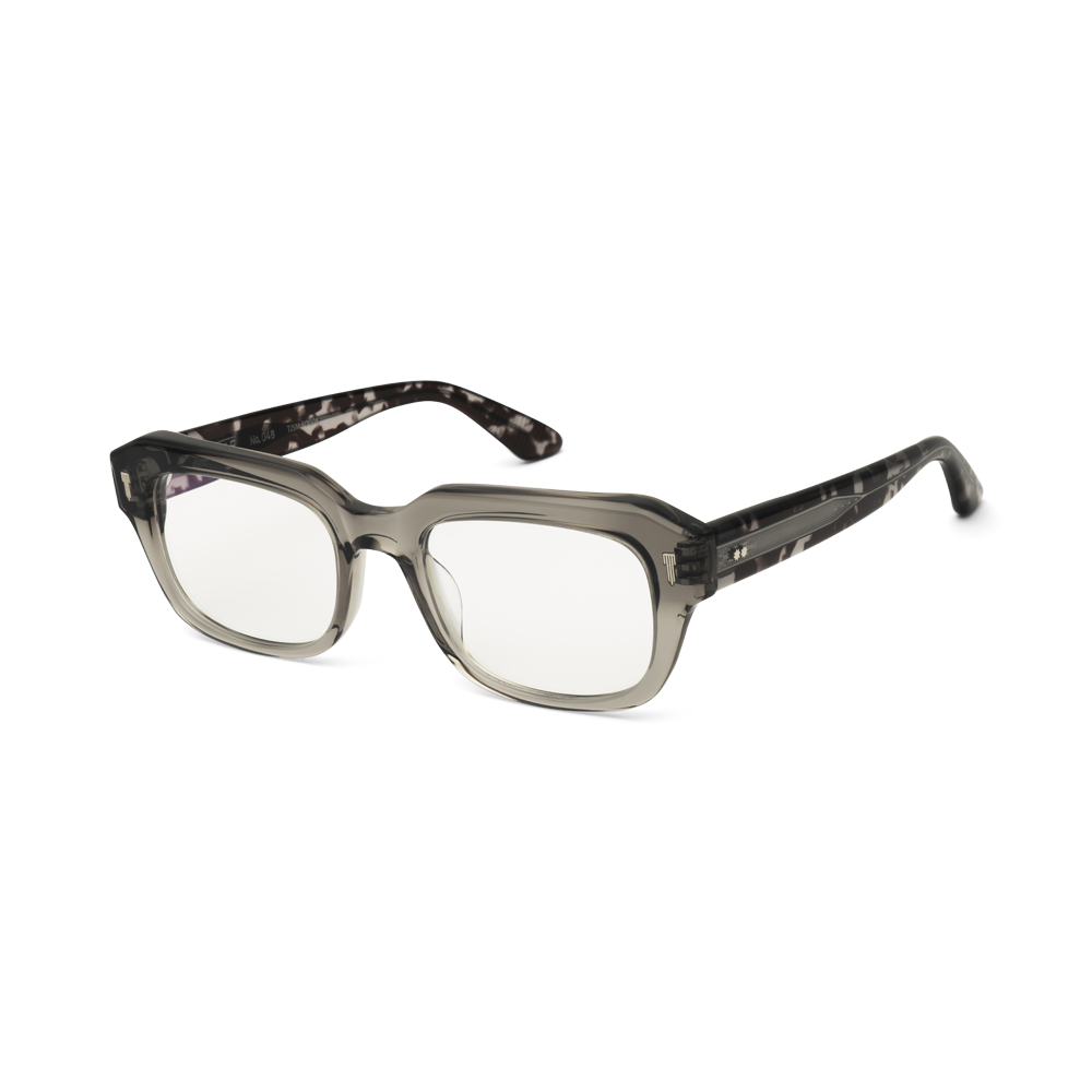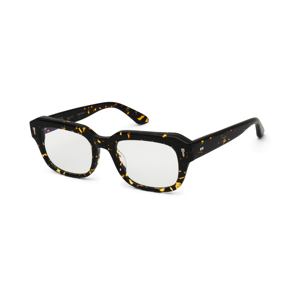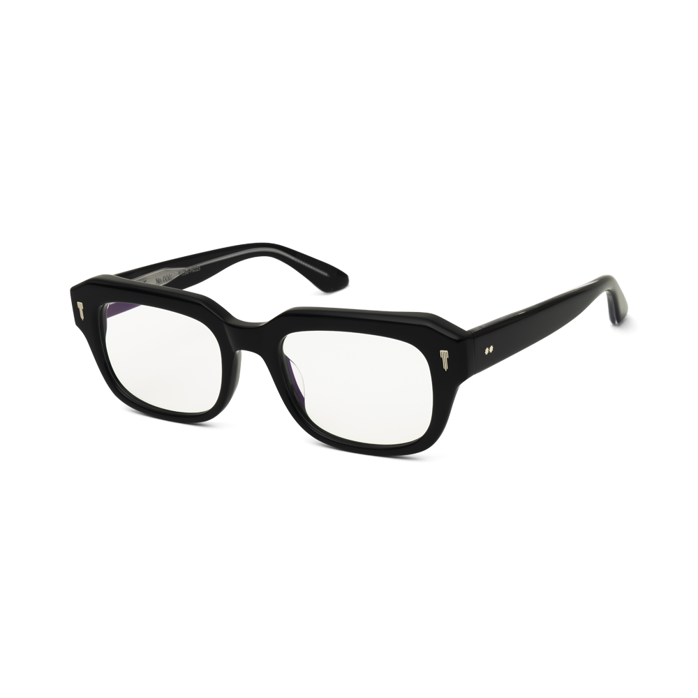 Bold rectangular silhouette. Custom front pin ornaments with Art-Deco hairline filigree. 7-barrel hinges with custom spur shaped riveting system. 2 base Nylon lenses with backside anti-reflective coating and 100% UV protection. | |