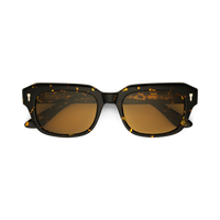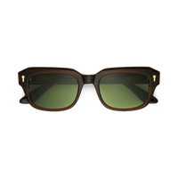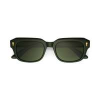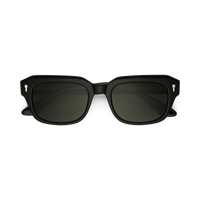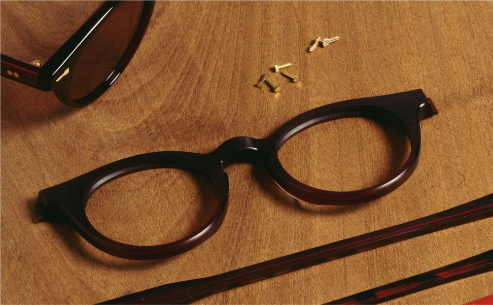 Bold rectangular silhouette. Custom front pin ornaments with Art-Deco hairline filigree. 7-barrel hinges with custom spur shaped riveting system. 2 base Nylon lenses with backside anti-reflective coating and 100% UV protection.