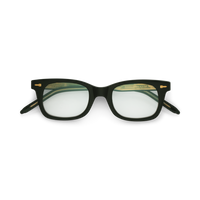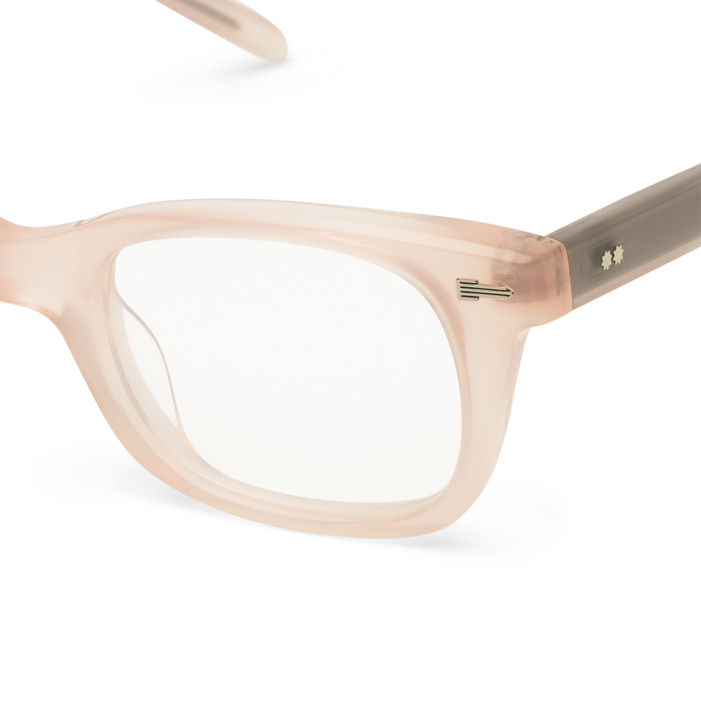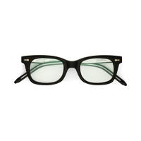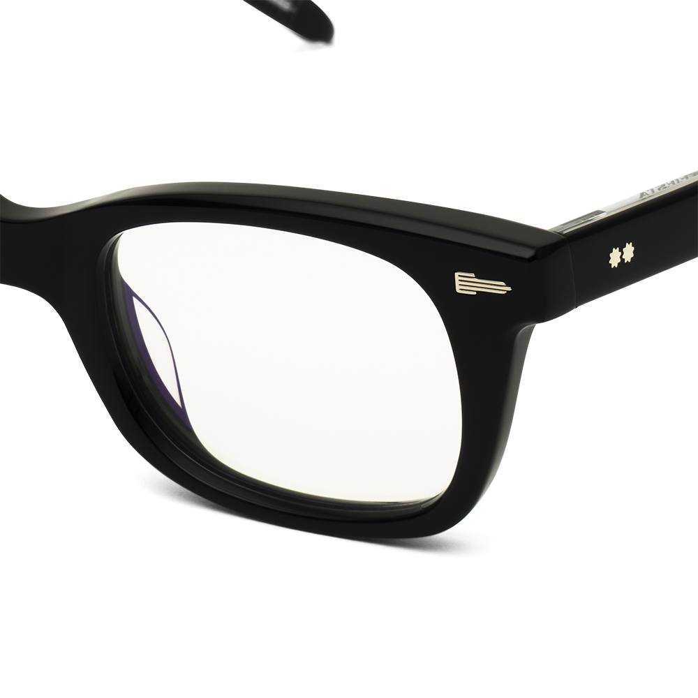 Petite wayfarer silhouette featuring subtle bevel cuts along the top and sides of the lens. Custom front pin ornaments with Art-Deco hairline filigree. 5-barrel hinges with custom spur shaped riveting system. 2 base Nylon lenses with backside anti-reflective coating and 100% UV protection. | |
